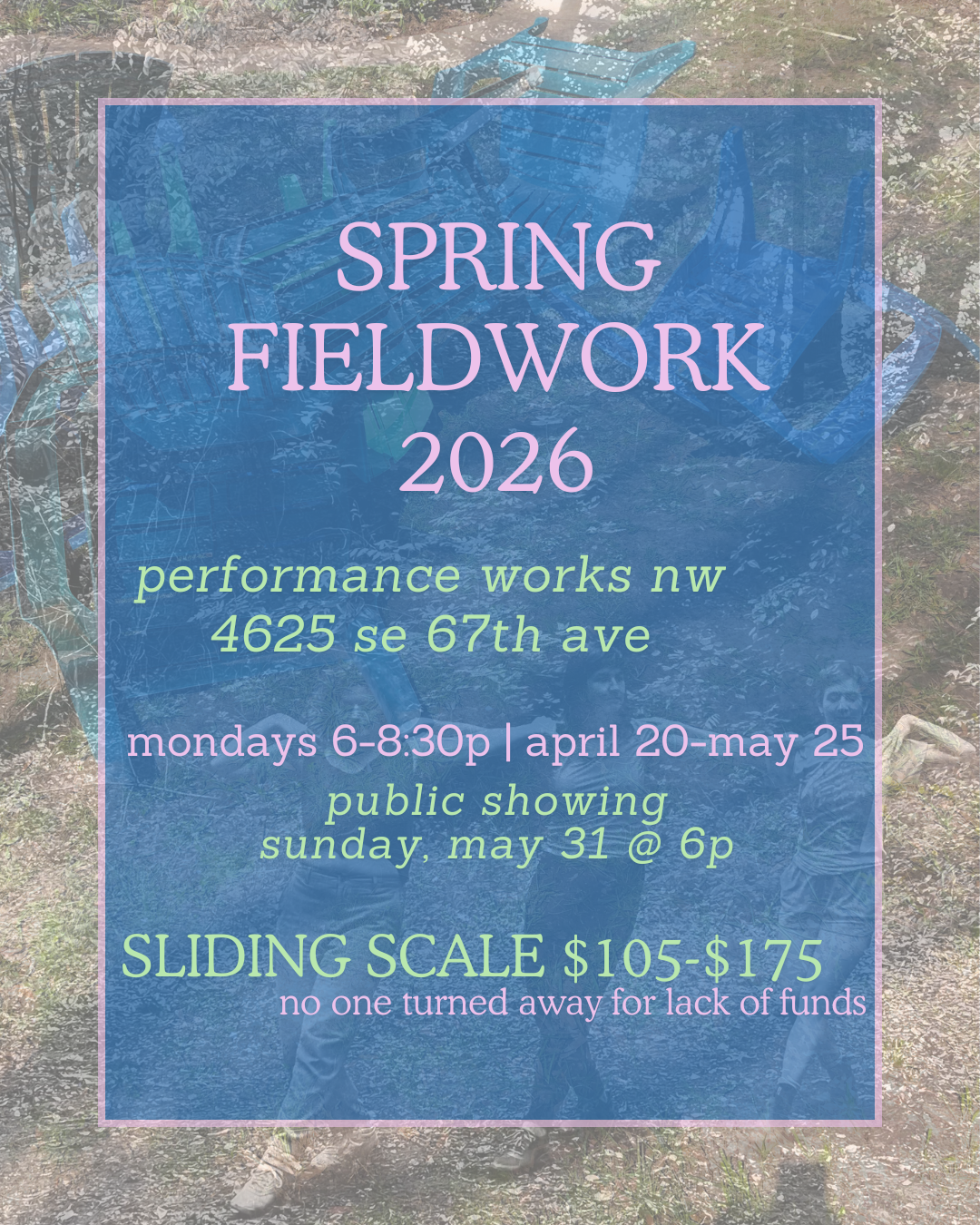 Fieldwork is a framework for artists of any and every discipline to play, experiment, fail, collaborate, and most importantly, give and receive structured peer feedback. The primary goal of Fieldwork is to provide structure and support for an artist's process. Fieldwork approaches this goal by providing artists with a place to: show work and get feedback; develop their abilities to see work and put their reactions into useful comments; combat the isolation that can come with being an artist; have a weekly deadline structure; meet other artists as peers, potential collaborators and/or performers; and to participate in discussions with other artists.