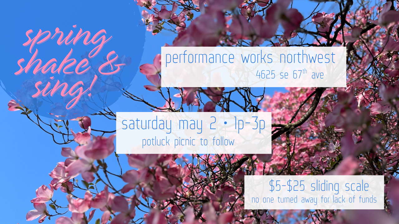 shake & sing is a low stakes movement and voice workshop and gathering. participants will come together for a body-based, guided/improvised shaking warm up, followed by group singing involving rhythm and rounds. if you’ve ever moved your body in any way or ever made any sounds with your mouth, this offering is for you— all levels welcome!!